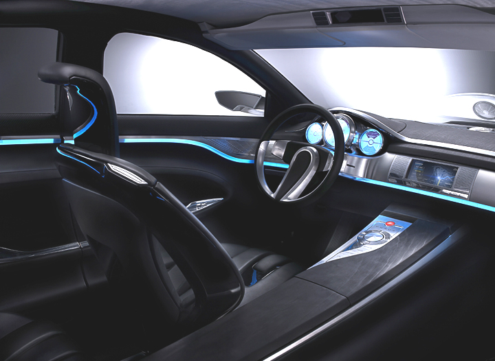 The concept sedan features single, slim-wedged headlamps which have evolved from the twin-lamp motif seen on past Jaguars. The lights are thin and angular, producing an aggressive look for the car’s front profile. Running from the headlamps to the rear wheel haunch is an unbroken, main feature line that gives the car a sense of power and movement. Furthering the vehicles aggressive appearance are the muscular bonnet, side power vents, tapered tail and deeply recessed front grille.