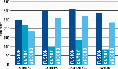 ![]() The Fusion outperformed the Camry and Accord in the following attributes: attractive, fun to drive, performance and handling. |