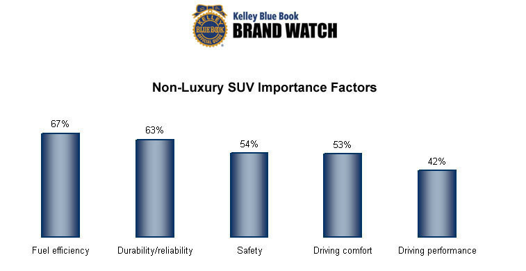 IRVINE, Calif., March 20, 2007; Kelley Blue Book and Kelley Blue Book Marketing Research's latest report series, Brand Watch, which reveals key decision factors among consumers in the purchase consideration process, shows the two most important factors of luxury SUV shoppers are driving comfort and driving performance, whereas the non-luxury SUV shopper considers fuel efficiency and durability/reliability the two most important factors in considering an SUV. Falling in the middle of the top five consideration factors for both of these groups is safety. Among luxury SUV shoppers Lexus ranked No. 1 for driving comfort, their top consideration factor. Among non-luxury SUV considerers, Toyota ranked No. 1 for fuel efficiency, durability/reliability and safety, the segment's top three consideration factors.