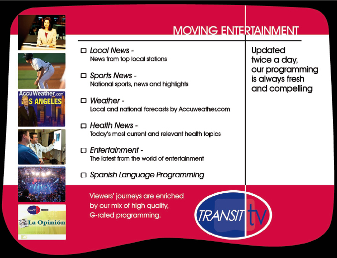Transit TV enhances riders' journeys, while also providing Transit agencies with an additional revenue source and enabling advertisers to reach a previously untapped young audience.