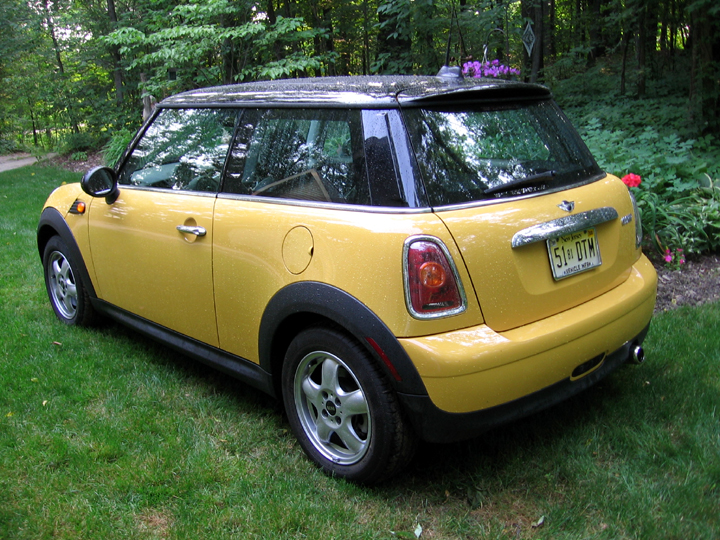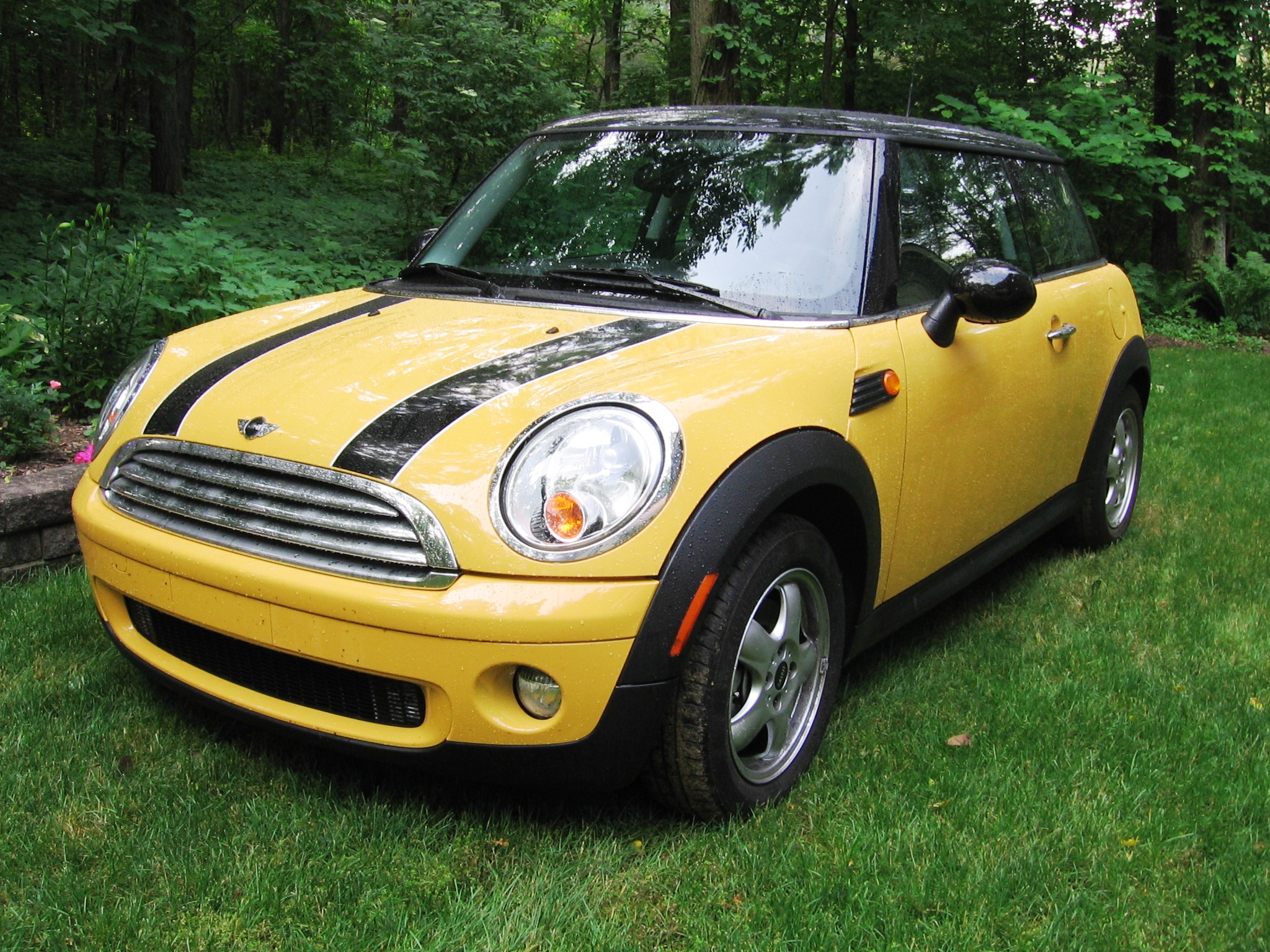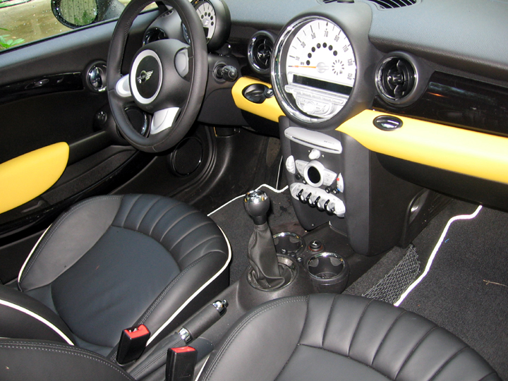 The base price of the Cooper is $18,050 and the bottom line on our yellow funster says $25,370 – still a bargain I say. (The turbo-charged MINI Cooper S starts at $21,850.) Options on our test car include leather interior, Dynamic Stability Control, leather steering wheel, heated mirrors and washer jets, rear spoiler, black bonnet stripes, chrome line interior, extended décor rings, color line mellow yellow, interior piano black trim, dual-pane panoramic sunroof, sport seats, heated front seats, front fog lamps, automatic A/C, Sirius Satellite Hd radio, and a destination charge of $650.