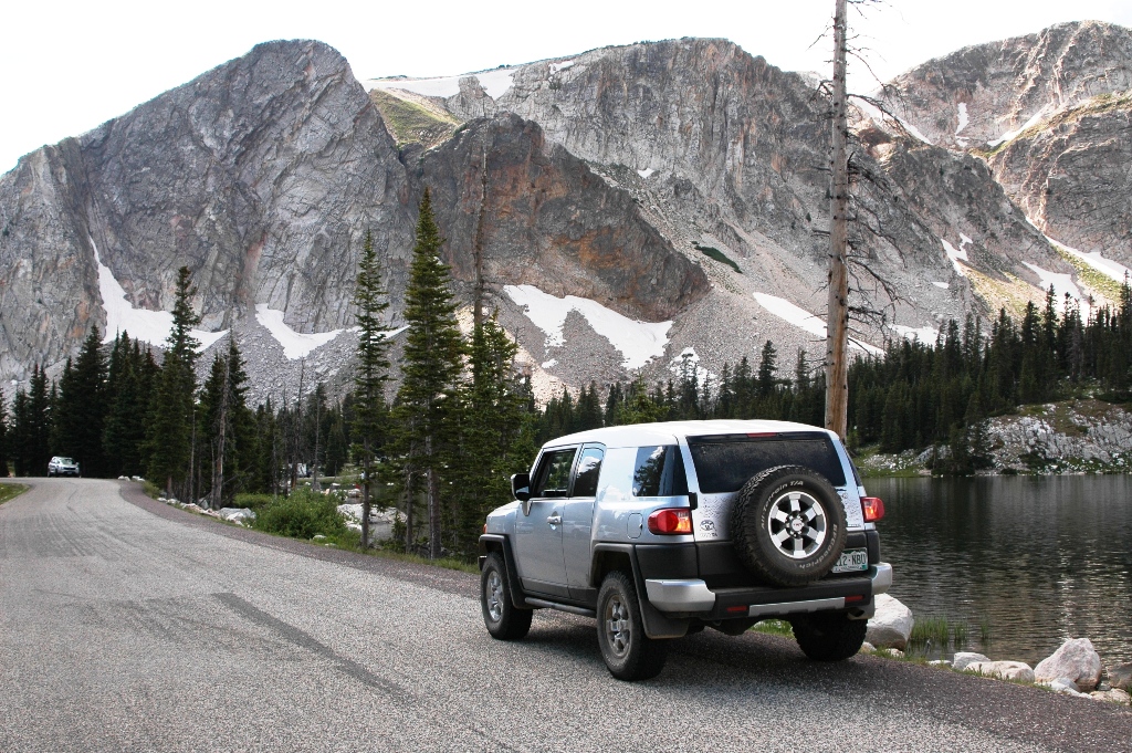 Finally we headed south on US 130 for a few miles where the road turns sharply east into the Snowy Range. We stopped at the National Forrest welcome shack where volunteers, Wave and her husband Leonard, browsed the maps with us. Leonard, who Wave claims knows the park like the back of his hand, suggested Road 234, just past Ryan Park, to Phantom Lake to test the FJ. Sounds like just what we’re after.