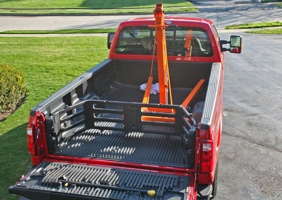 ![]() A large cherry picker easily fit in the bed of the F-350 with the tailgate closed. The bed divider kept the engine hoist toward the front of the bed |