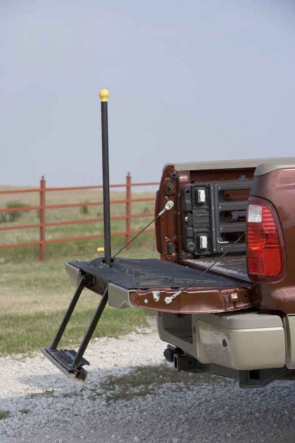 ![]() The integrated tailgate ladder is a helpful option. It pulls out from the gate, and an assist pole stands up to make the big climb up into the Super Duty's bed something a non-super human can achieve |
