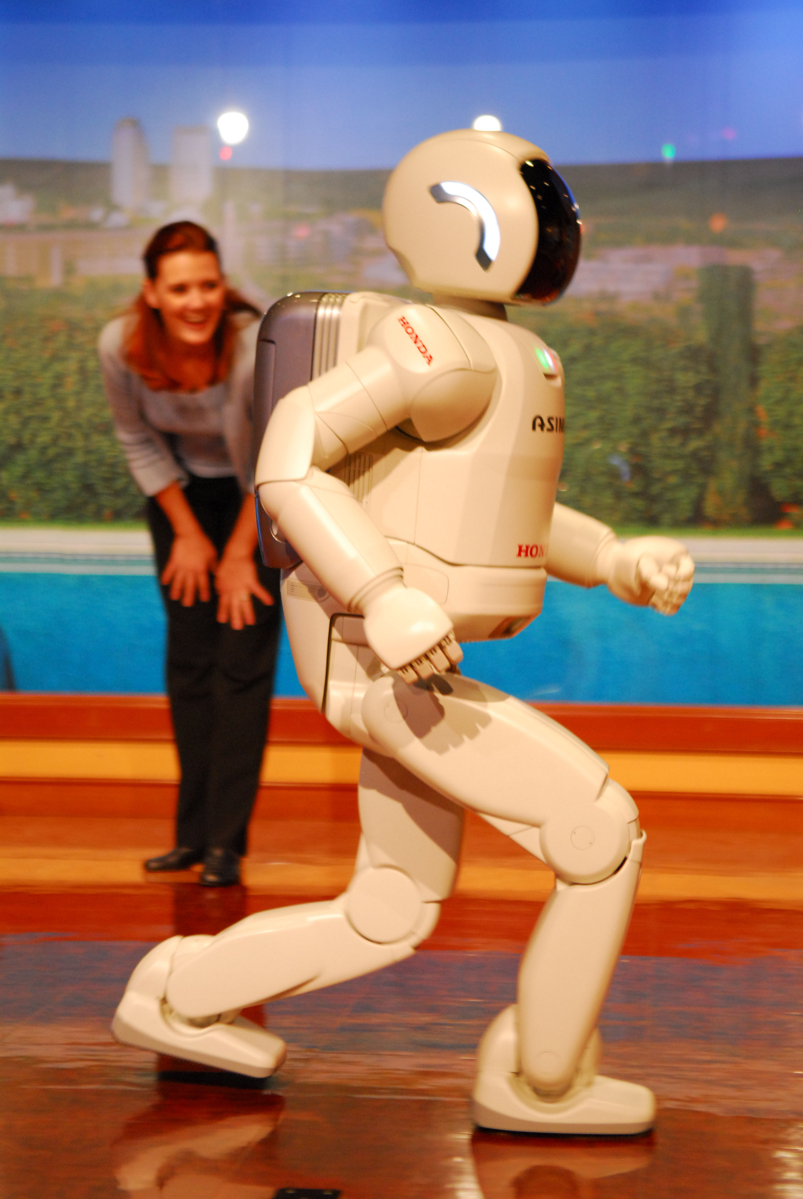 ASIMO (Advanced Step in Innovative Mobility) is the world's most advanced humanoid robot, with the ability to run, walk forward and backward, climb stairs, turn smoothly without pausing, and maintain balance, even while walking on uneven slopes and surfaces. Honda engineers began developing a humanoid robot in 1986 for the purpose of someday helping people in need. After years of research and development, they created an advanced humanoid robot able to function in real-world environments. ASIMO originally made its U.S. debut February 14, 2002, when it rang the opening bell at the New York Stock Exchange and the latest version of ASIMO, which includes the ability to run, debuted in North America at the Consumer Electronics Show, January 2007, in Las Vegas. Learn more about ASIMO at asimo.honda.com.