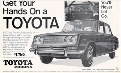 ![]() 1967: Toyota introduces the advertising theme "Get Your Hands on a Toyota..." for the Corona |