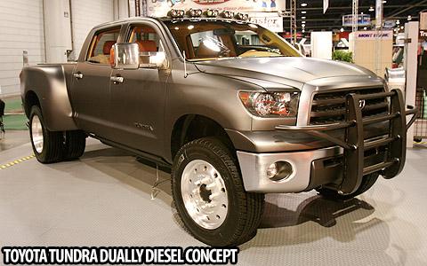 Washington DC November 5, 2007; The AIADA newsletter reported that at the Specialty Equipment Market Association show last week, Toyota Motor Corp. quietly parked in its display of wild tuner cars the Tundra Diesel Dually, a concept truck that could be a template for Toyota's entry into heavy-duty pickups.