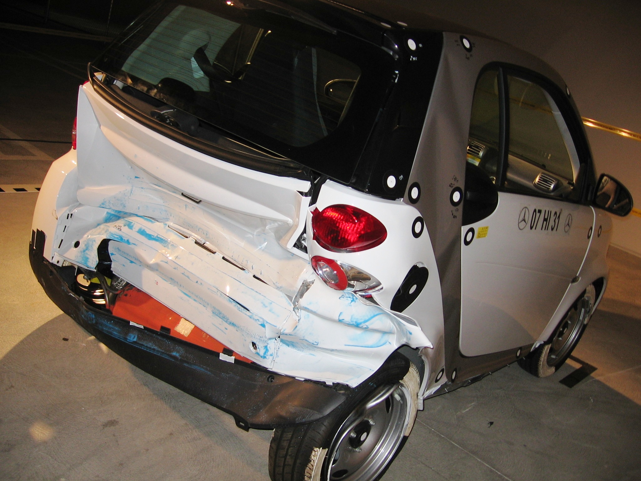“Yes. But is it safe?” you ask. Certainly, there are rules of physics that a tiny car can’t transcend. But think about a race car that can crash at 150 mph with the driver climbing out the window unhurt. The structural integrity of the smart is amazing. A display at the California launch showed the “tridion safety cell” that is the essence of the structure defined by that horizontal arch so apparent from the side view. The cockpit acts much like the shell of a walnut protecting the nuts within. Crash dynamics are designed so that rear and front crash forces are guided downward and side impacts are mitigated by reinforcements in the doors and B-pilars and the exaggeratedly short wheelbase, which allows the wheels and axles to absorb part of the energy. Four air bags, two in front and two on the sides, protect the nuts as well.