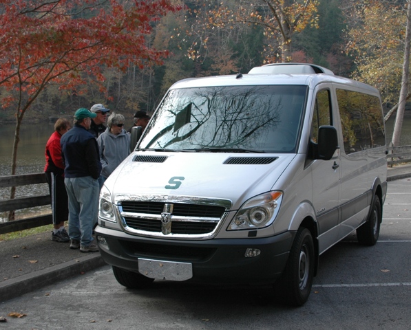 We tested the Sprinter’s handling and ride characteristics that evening with a drive to a classic small town eatery I had discovered on a previous trip to the area, the Stearns Restaurant in lovely downtown (that’s a semantic stretch) Stearns. Southwest from Cumberland Falls, Highway 90 winds generally toward US 27 the major north/south route through this part of Kentucky. Not far past the Cumberland River, narrow, smooth Highway 700 branches off to the southwest giving us a shortcut to our destination. The complete lack of any shoulder combined with sharp drop offs at pavement’s edge make for no margin of error. The Sprinter swung and swayed through this 15 miles scenic (even after dark) two-lane admirably with surprisingly precise steering and less than expected lean. At the wheel I was impressed. Those in the back however were getting a bit queasy by the time we reached our destination. Since we were driving after dark there was no horizon for anyone to focus on in spite of the intense high-beam, bi-xenon headlights that lit up the country scenes and forests at the road’s edge, so most back there were a tad sea sick. All Sprinters come standard with ABS, traction control, tire pressure monitors, electronic brake force distribution, electronic roll mitigation and dual-stage air bags up front – as much safety and handling control systems as most high-tech automobiles.