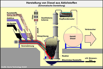 The company uses the method of "fractioned depolymerization", which is similar to cracking crude oil. In a thermal treatment process, long hydrocarbon chains are shortened until they are as long as heating oil or diesel. The method was developed and tested at the end of the 1970s and was proved to work even then, although the general conditions at the time were not suitable for profitable operation of the plant. In its own laboratories, Clyvia Technology GmbH has proved that the transformation of used oil, flushing oil and polymers into diesel or heating oil works.