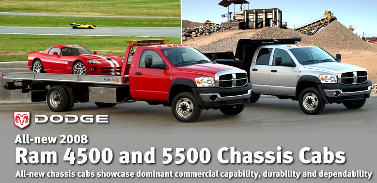 "The all-new 2008 Dodge Ram 4500 and 5500 Chassis Cabs not only continue Dodge's commercial vehicle expansion, but these powerful, capable work trucks fill yet another white space opportunity within the commercial vehicle market," said Ewasyshyn.