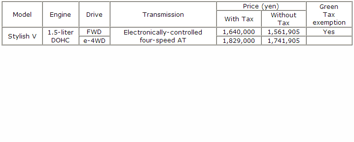 The manufacturer’s suggested retail price for the Stylish V special edition is 1,640,000 yen for the front-wheel drive (FWD) version and 1,829,000 for the electronically controlled four-wheel drive (e-4WD) version (both prices include consumption tax).