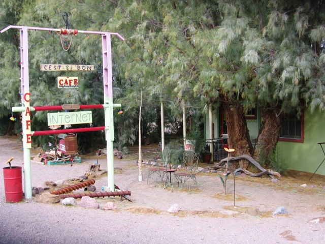 Just a few hundred yards down the road, at the edge of the settlement of Tacopa, is another gourmet eatery, also owned by David, called Pastels Bistro, known for their creative pizza. Another clump of birds of paradise became table decorations (again, only about a half dozen tables) and a bouquet for the counter, compliments of Mojave Moses. Coffee, tea and a leisurely chat with the amazingly enthusiastic culinary staff ensued before we headed back to Blue Diamond in the dark. These desert roads are especially glorious, by the way, on a warm, moonlit night in a convertible with the top down – a mystical experience to be sure.