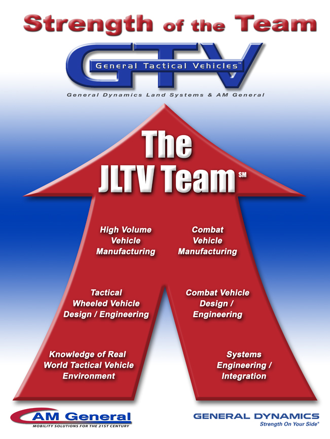 General Tactical Vehicles is a joint venture between AM General and General Dynamics Land Systems, a business unit of General Dynamics , formed to provide the U.S. Army and U.S. Marine Corps a low-risk, affordable, technically advanced and economically sustainable solution to their Joint Light Tactical Vehicle requirements. In 2006, both AM General and General Dynamics were awarded JLTV "Best Technical Approach" trade studies by the Office of Naval Research. More information about General Tactical Vehicles is available online at GTV.