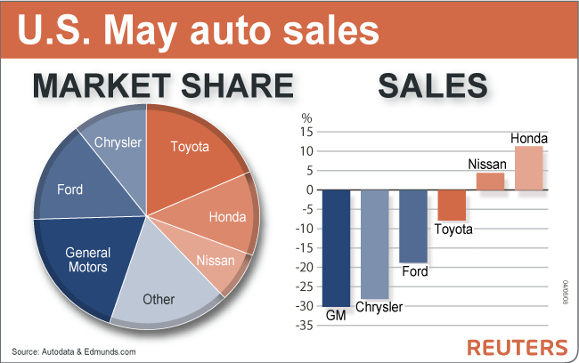GM sales plunged 30 percent, Ford sales fell 19 percent and Toyota's fell 8 percent. GM's U.S. market share slid to 19 percent in May, a record low for the embattled automaker that commanded 45 percent in 1980.