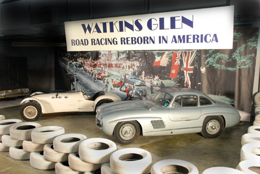 The cars are displayed in dioramas that represent some of the famous race courses where they actually competed: Watkins Glen, Bonneville, Sebring, the Mille Miglia and Le Mans.