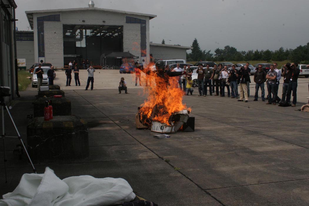 While Schwarz stayed cool the whole time, it was a different story with the uvex carRacing stuntman. But in the end, he also had to cross a petrol-soaked sea of flames to demonstrate the fire resistance of a racing suit. Thanks to NOMEXÒ fibres, the man remained unscathed of course. To make sure that the press didn't miss a single highlight, IKmedia provided them with two shuttle vans to cover the huge terrain. While riding the bus can tend to be boring elsewhere, IKmedia provided action here as well for its clients. The passengers couldn't believe their ears when the SEAT Alhambra started up sounding like a Formula-1 racing car, thanks to a virtual engine-sound generator from in.pro. And in contrast to the military equipment in the hangars, there was no need for the products of the IKmedia customers to be shrouded in a veil of secrecy.