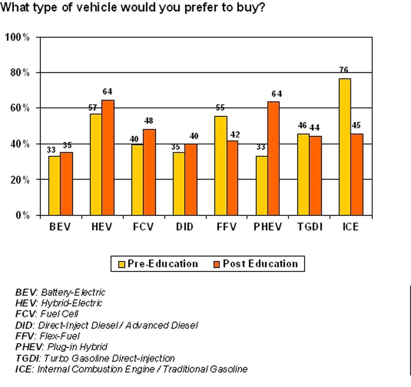 "This shows that consumers are still confused by the choices of alternative propulsion technologies and their relative advantages," says Miller. "Manufacturers need to do a better job of communicating the benefits to potential buyers. For example, our survey shows that purchase consideration of plug-in hybrids almost doubles when respondents learn what it actually is, while consideration for flex-fuel vehicles drops significantly after respondents learn about their benefits and liabilities."