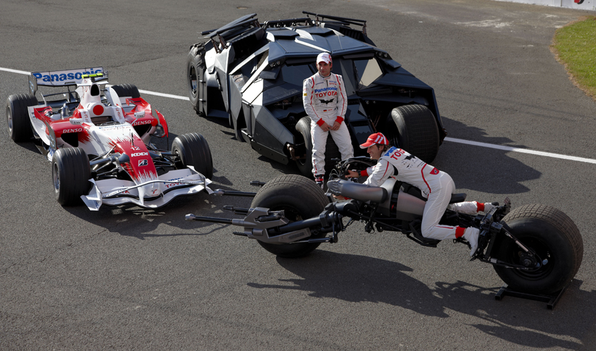 LONDON - July 4, 2008: Formula 1 met Hollywood at Silverstone yesterday when Panasonic Toyota Racing's TF108 Formula 1 car drove head-to-head with the 'Batmobile', as part of a promotion for the new Batman movie, The Dark Knight. Timo Glock drove the TF108 alongside the Batmobile, which made a Formula 1-style pit stop, while Jarno Trulli had the chance to sample the Bat-Pod vehicle. In addition to the on-track action, Panasonic Toyota Racing is also featuring The Dark Knight artwork on the TF108, the drivers' outfits, and the team's motorhome. Available video includes highlights from the event and driving shots of the TF108 race car and of the Batmobile around the Silverstone circuit.