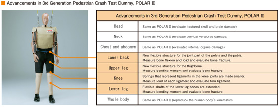 In 1998, Honda became the first in the world to develop a pedestrian crash test dummy to reproduce the human body’s kinematics during vehicle-to-pedestrian collisions, with the aim of identifying parts of the vehicle body most often resulting in injuries, and developing safety technologies to reduce pedestrian head injuries during the collision with a vehicle. In 2000, Honda broadened the scope of its effort to mitigate pedestrian injuries by developing the second generation pedestrian dummy, POLAR II, which improved reproduction fidelity of the human body’s kinematics and measured the level of injury in eight body areas, including the head and neck through use of embedded instruments. Additionally, Honda conducted independently developed simulations in which the kinematics of the body and injuries were reproduced.