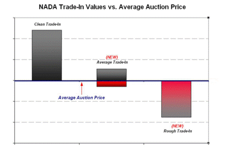 As illustrated below, NADA’s “Clean” Trade-In values often carry a premium over the AuctionNet® average price. The new “Average” Trade-In value will be closer to the AuctionNet average price, while “Rough” Trade-In will often be lower than the AuctionNet average price.