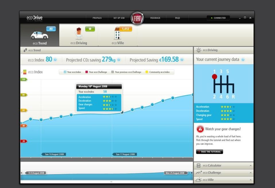 Drivers who start eco:Driving can expect to improve their driving efficiency by up to 15 per cent. That means a 15 per cent reduction in CO2 emissions and in fuel costs. Fiat has also created ecoVille, a unique online community populated by all eco:Drivers from around the world. Users will be able to share tips, watch the community grow, and see just how much CO2 they are all saving together.