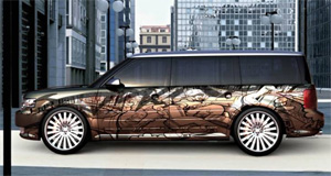 Enter Catalyst Industrial Marking and their history of pushing personalization to the edge with Raceskinz™ Premium Composite Graphics & Accessories. Their take on Ford Flex Limited features Timeless Brushed Metal components that include: exterior lid (roof), mirror covers, rear door fascia, plus interior door and dash trim. The Flex by Catalyst also introduces LIIV™ (live), the first wireless internet entertainment system for your automobile that enables passengers to enjoy web surfing, online games, e-mail, downloaded movies, music and more.