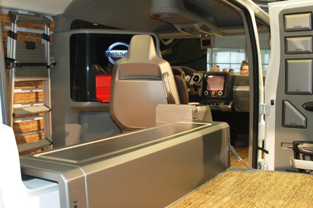 The NV2500 Concept is configured as a construction supervision vehicle suitable for Habitat for Humanity, with whom Nissan has a charitable relationship. The “3-Zone” design includes an office space with computer workstation, fold-down conference table, cubbies and storage in every nook and cranny, cargo racks, nearly six-foot interior height and an awning-style side panel that opens into an outside work table, and open cargo area in the rear with lots of 110/220W electrical outlets.