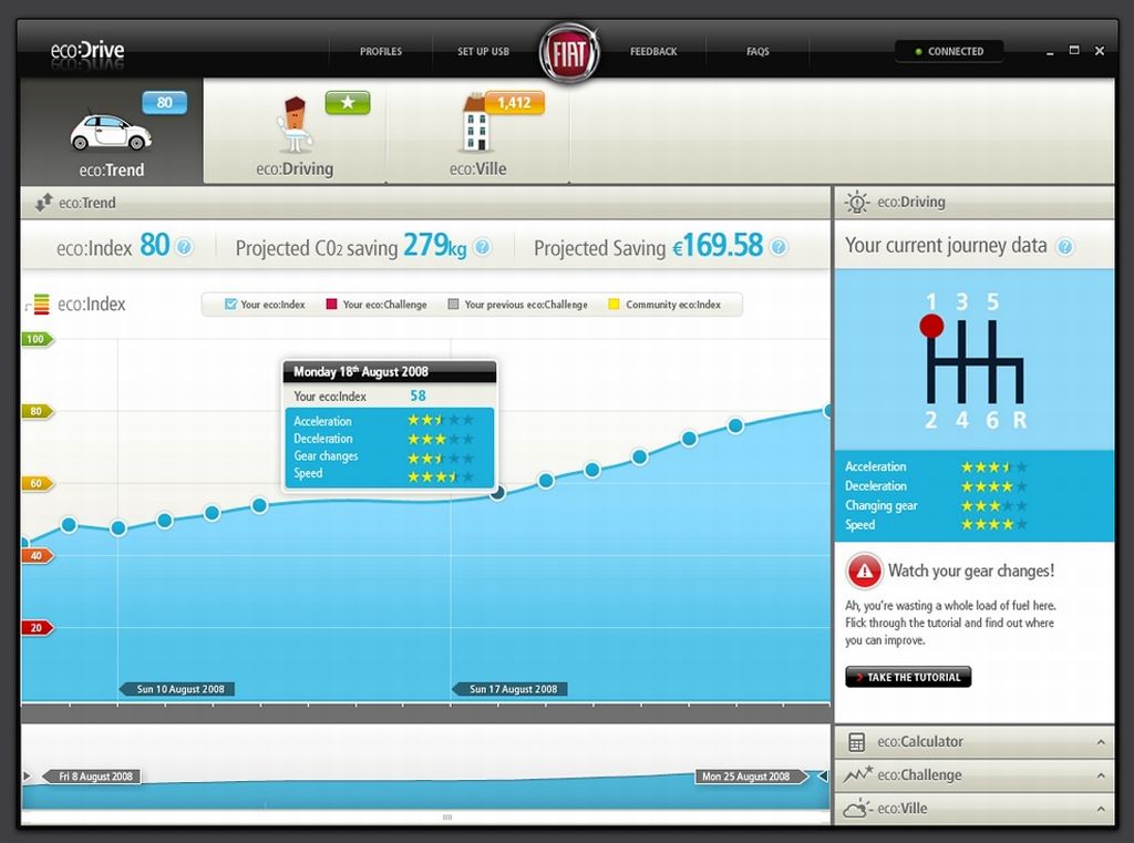 Launched by Fiat at the 2008 Paris Motor Show, eco:Drive is a free-of-charge tool that helps drivers understand the impact of their driving style on fuel consumption and CO2 emissions.