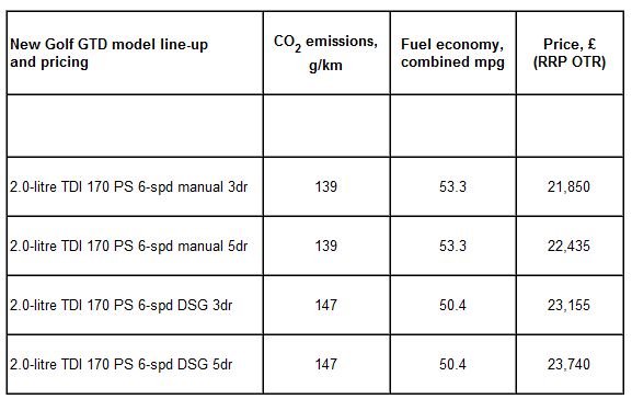 As with the entire Golf range, the new GTD will feature class-leading levels of safety with ABS, ESP (Electronic Stabilisation Programme) and seven airbags, including for the first time a knee airbag, all standard. The Golf was recently awarded a maximum five-star rating by the EuroNCAP crash testing agency.