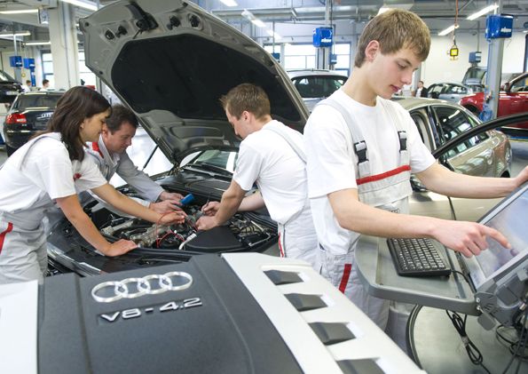 Audi offers training in over 20 fields at its two German locations. They include commercial, logistic and IT lines of industry, as well as automotive engineering, automation and production engineering. In addition, young people can complete training as technical product designers, automotive interior designers or in various gastronomic fields. An especially interesting opportunity is afforded to suitable apprentices in the fields of automotive mechatronics, mechatronics, electronics for automation engineering and tool mechanics: These people can opt for additional dual training culminating in advanced technical college entrance qualification.