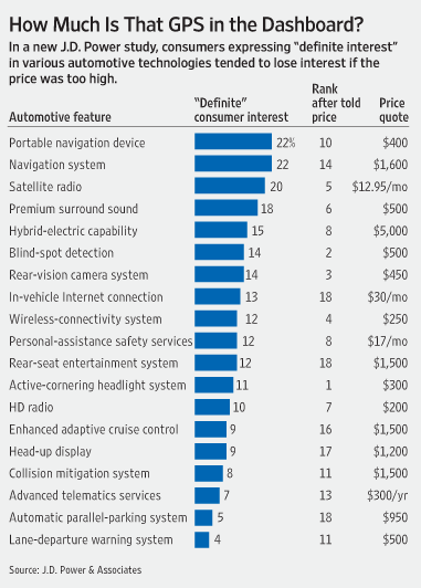 The study also finds that consumer interest in a navigation system is at 67 percent prior to the average market price being revealed, but falls to just 20 percent after the market price of $1,600 is known. However, among owners of premium vehicles, interest after the price is revealed is 45 percent.