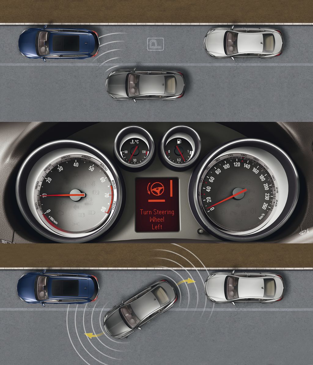 The Park Assistant can be activated as soon as drivers traveling up to 30 kilometers per hour edge 1.8 meters away from a row of cars. As soon as a sensor located on the side of the vehicle recognizes a space, it signals the driver on the central display and begins giving steering instructions. Through ten sensors on the front and back bumpers, the Insignia can predict all possible obstacles and send out warning signals in advance.