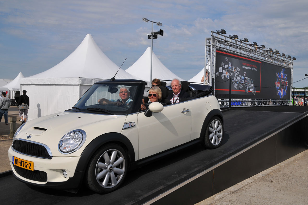 SILVERSTONE, May 22, 2009; The ‘Mini United 2009’ decal on the glass rear window of our Cooper S Convertible gives away our destination: the Mini United Festival at the Silverstone race track. That’s the place where the celebrations for Mini’s 50th birthday will take off.