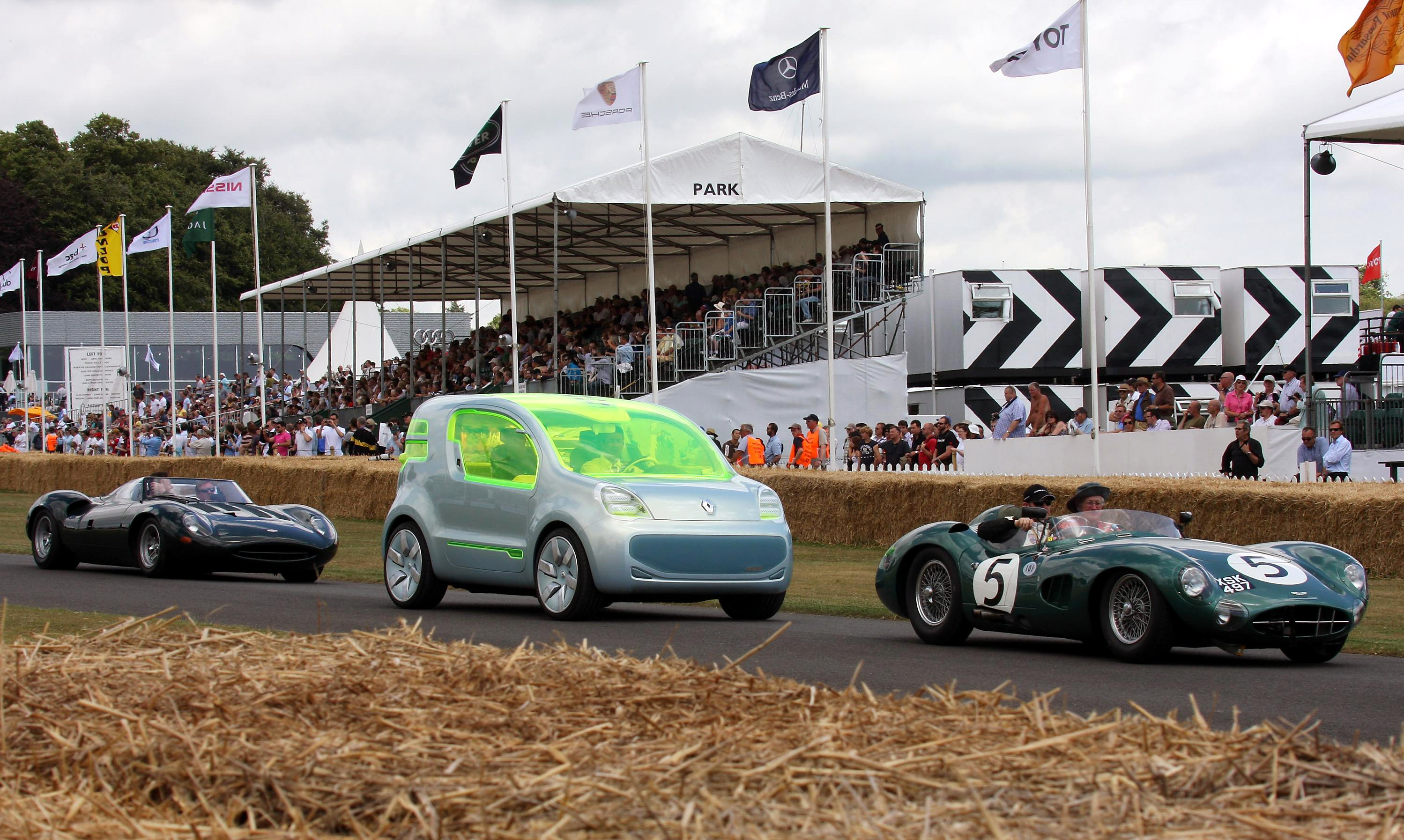 As the only one of its kind, and worth around £2 million, the hand-built concept car navigated its way serenely around the route, providing a remarkable contrast to the vintage road and race cars around it. At one point on the route, close to Goodwood House, the outlandish Z.E. Concept, replete with its Acid Green windows and roof-mounted solar panels, joined a Jaguar XJ13 and Aston Martin DBR1 for arguably one of the most surreal car parade sights ever seen at the Goodwood Festival.