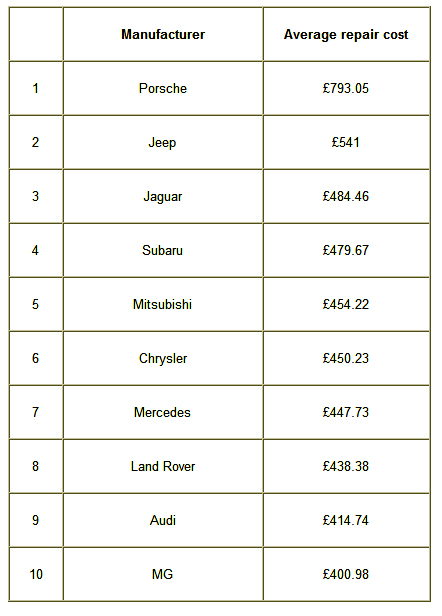 Although Porsche is the 10th most reliable car on the road, the German marque has the most expensive average repair bill (£793.05) of the 30 manufacturers analysed by Warranty Direct.