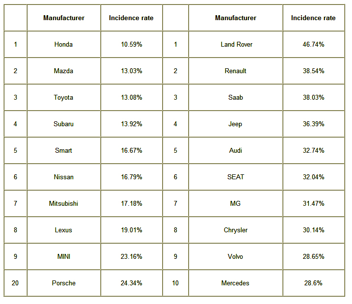 Honda claims top spot as the brand least likely to break down with fellow Far East manufacturers Mazda, Toyota, Subaru, Nissan and Mitsubishi close behind in the Top 10. At the other end of the table, off-road favourite, Land Rover, records failure rates of 47 percent in an average year.