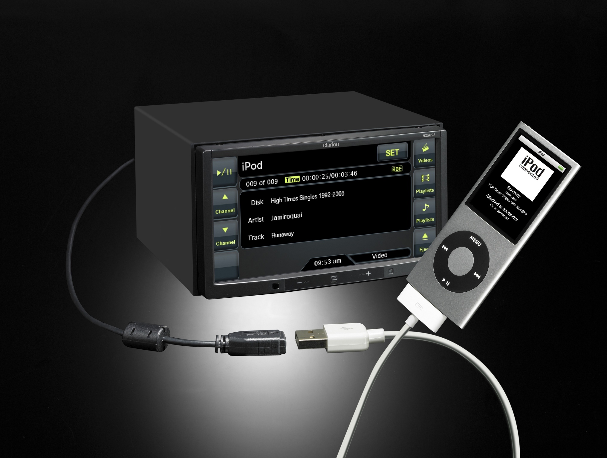 Direct iPod control is via the rear USB connector and the USB cable supplied with the iPod – offering easy operation either via the NX509E’s fully-motorised 7-inch QVGA colour touch-screen or through the iPod itself – whilst iPod video playback is also possible via an optional cable.