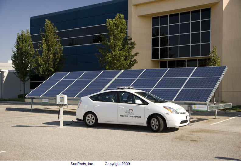 San Jose CA. October 12, 2009; SunPods announced today the first public demonstration of their revolutionary SunPods’ EV Plug-N-Go™ Solar Powered EV Charging System. The world’s first transportable, modular, integrated solar powered electric vehicle charging station, ready to power up on delivery.