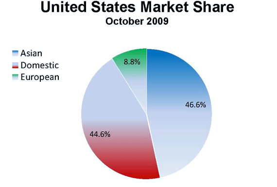 International Brands Build Market Share According to numbers from Autodata Corp., international brands sold 463,984 units in October, up from 419,080 in September, and 448,351 in October 2008. Asian brands accounted for 46.6 percent of the market, down from 46.5 percent in September 2009, and European nameplates had an 8.8 percent share, down from 9.6 percent in September. Domestic brands finished the month with 44.6 percent of the market, up from 43.8 in September.
