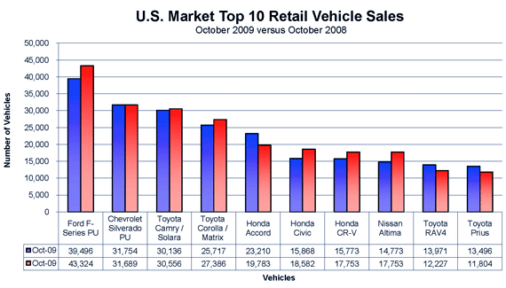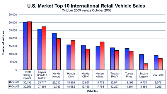 As was the case last month, international vehicles again held 10 of the top 20 spots. The Subaru Legacy made strides, cracking the top 20 for the month of October with sales of 9,705, up 150 percent from October 2008.