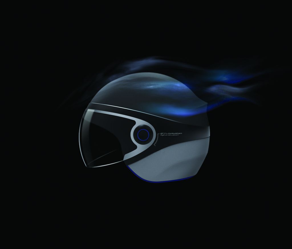 High transpiration of the materials and fluidity of forms: these are the keywords around which Pininfarina Extra’s designers created this new concept helmet. The first novelty, in fact, is the outer surface that is soft to the touch, because made of transpiring technical fabric. What does this fabric conceal? A shell conveniently pierced in three areas (at the back and sides) in which three pierced and shaped inserts in technopolymer are set. These "flow intakes" allow air to circulate inside the cap and the moisture inside to escape and, thanks to their design, they model the forms of the helmet aerodynamically, creating the superpressions and depressions necessary to the correct functioning of the system of ventilation. The fabric, stretched over the shell, not only follows the dynamism of the forms and allows the air to transpire, but it creates a waterproof filter impermeable to water and moisture.