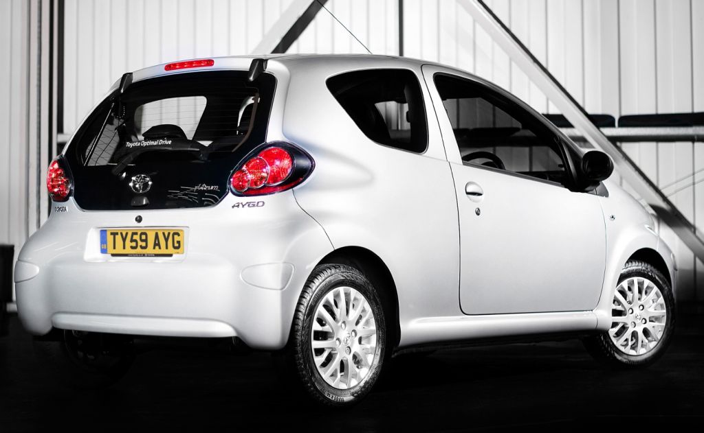Aygo Platinum builds on the specification of the Aygo+ model, adding 14-inch multi-spoke alloy wheels, Crystal Silver metallic paint, six-speaker audio system, Alcantara and leather upholstery and leather gear knob trim.