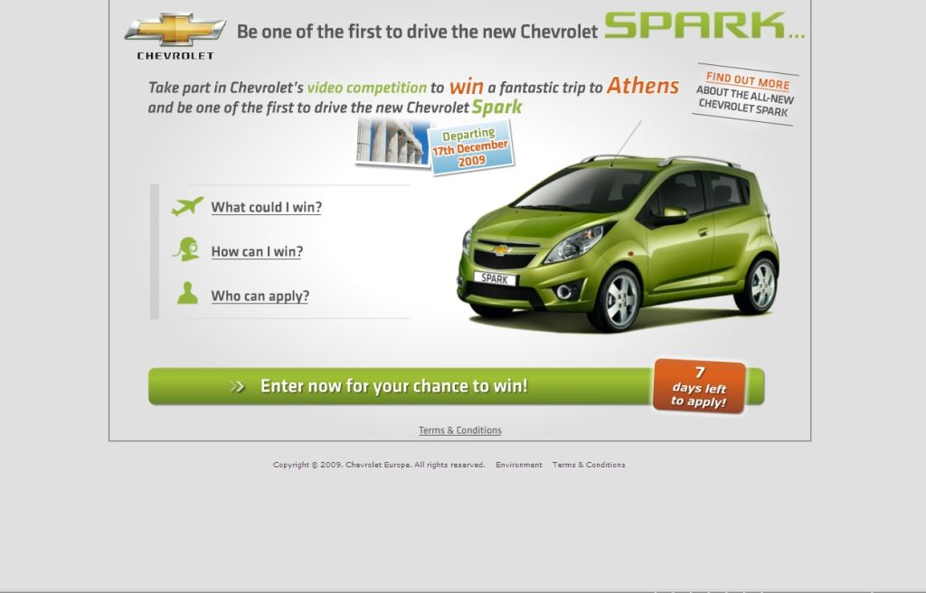 Celebrating the launch of the new Chevrolet Spark, which goes on sale in spring 2010, Drive the Spark www.drivethespark.co.uk gives entrants the chance to win a three-night trip to Athens to become one of the first people to drive the all-new city car.