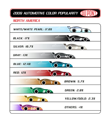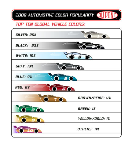 WILMINGTON, Del., Dec. 1, 2009 – DuPont announced that silver, black and white are the top colors in the first-ever ranking of worldwide vehicle color popularity. Now in its 57th year, the annual DuPont Global Automotive Color Popularity Report is the original and most authoritative source for automotive color popularity information and trends with detailed breakdowns for the top automotive markets as well as this year’s newly announced top global colors.