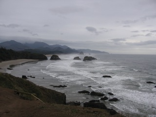Having spent too much time riding in the car this week we decided that a nice hike would be in order. The Ecola State Park at Cannon Beach offered great views of the coastline from a rocky promontory. There a trailhead marker indicated a 1-1/2-mile (each way) trail to Indian Beach just up the coast at the other end of the park. While it sounded just right it turned out to be a real challenge (for me at least) being 90% uphill both ways - or so it seemed. We could see the beach periodically from the trail but each time we thought we were headed down to it the trail turned steeply up again. After nearly an hour of huffing and puffing (again, for me at least) we arrived at the beautiful, sandy beach with huge rocks punctuating the shore. Cathy and Kim weren’t even breathing hard. The breeze was cool and gentle with overcast skies and huge waves pounding in. I could have sat there for hours meditating on that scene but our women are both a bit restless and wanted to get hiking back.