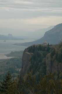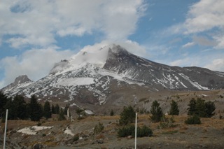 The lovely Mt. Hood finally presented herself to us through a distant haze, like a ghost just hinting at her presence. This is the only place in the US were people ski year around, they claim. We were about 20 miles away. By the time we drove up her side to the famous Timberline Lodge (built by the Civilian Conservation Corp in the 30s) the haze was gone and just fleeting thick clouds drifted slowly across her crest. While unimpressive from the outside Timberline Lodge is filled with hand carved woodwork and massive natural features. “The Shining” was filmed there.