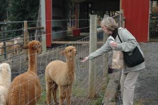 We followed signs onto a side road leading us to a farm called Cascade Alpacas of Oregon where proprietor, Tom Betts, spent time introducing us to his herd, the fiber, his two friendly cats and a “leaner” dog. Not lean in the skinny sense, rather the dog, a Great Pyrene, once petted by a stranger, will continuously lean on the petter and follow the petting hand closely. What a charmer! The alpacas are beautiful animals with pretty faces. One spit on Cathy while she tried to feed some others.