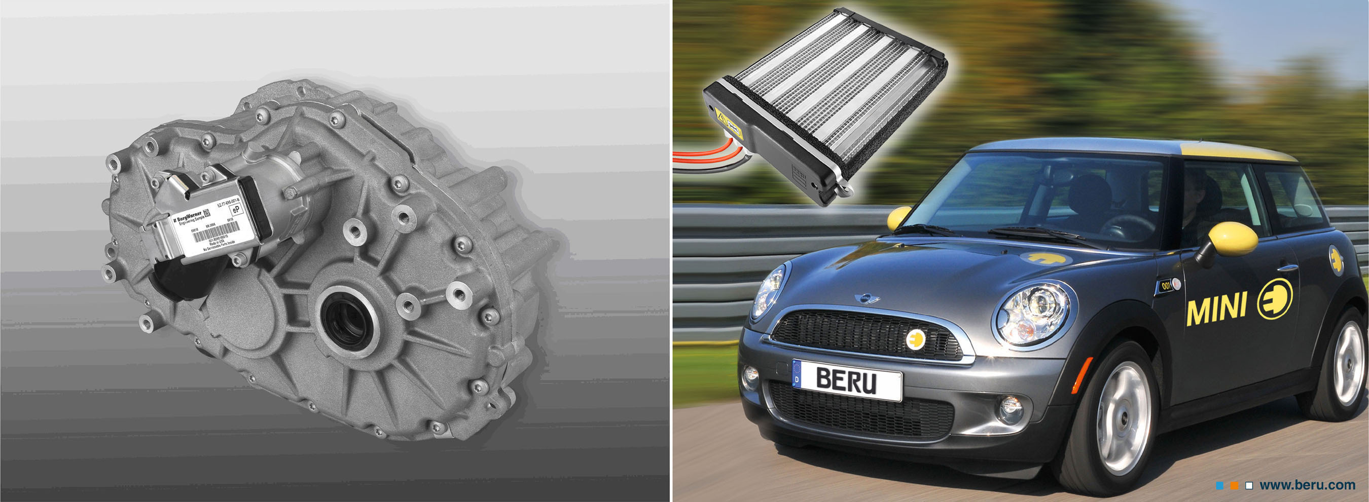 BorgWarner Drivetrain Systems' 31-03 eGearDrive(TM) transmission (left) and BorgWarner BERU Systems' high-power electric cabin heater, currently being piloted in the MINI E (right), will be showcased at the 2010 Electric Drive Transportation Association (EDTA) Conference and Exposition.