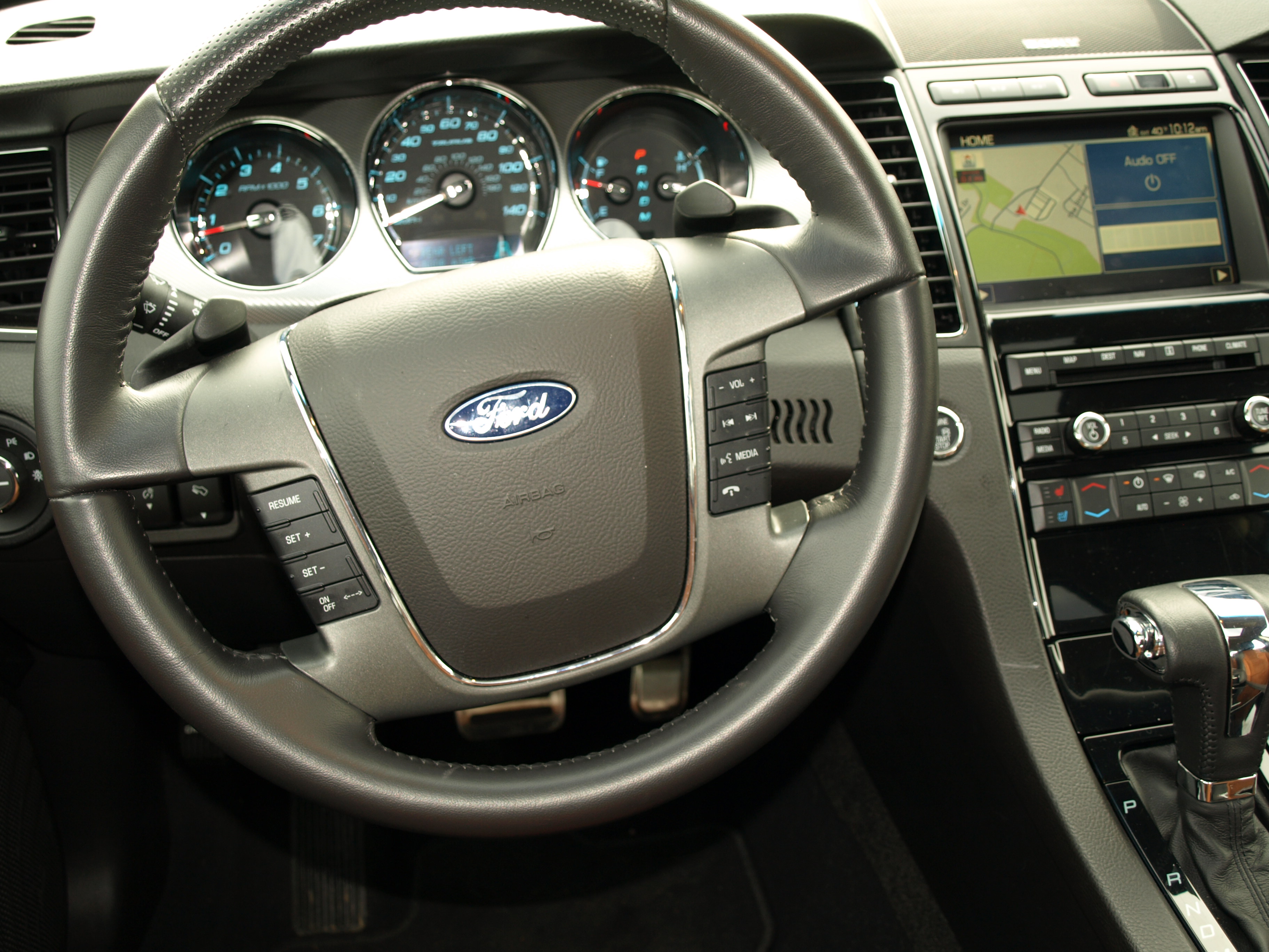 In addition, the SHO has adaptive cruise control that automatically maintains a set distance between you and the car in front, slowing the car if necessary. There’s also a collision warning system that lights up a row of red lights just under the windshield if the onboard computer senses an impending accident.